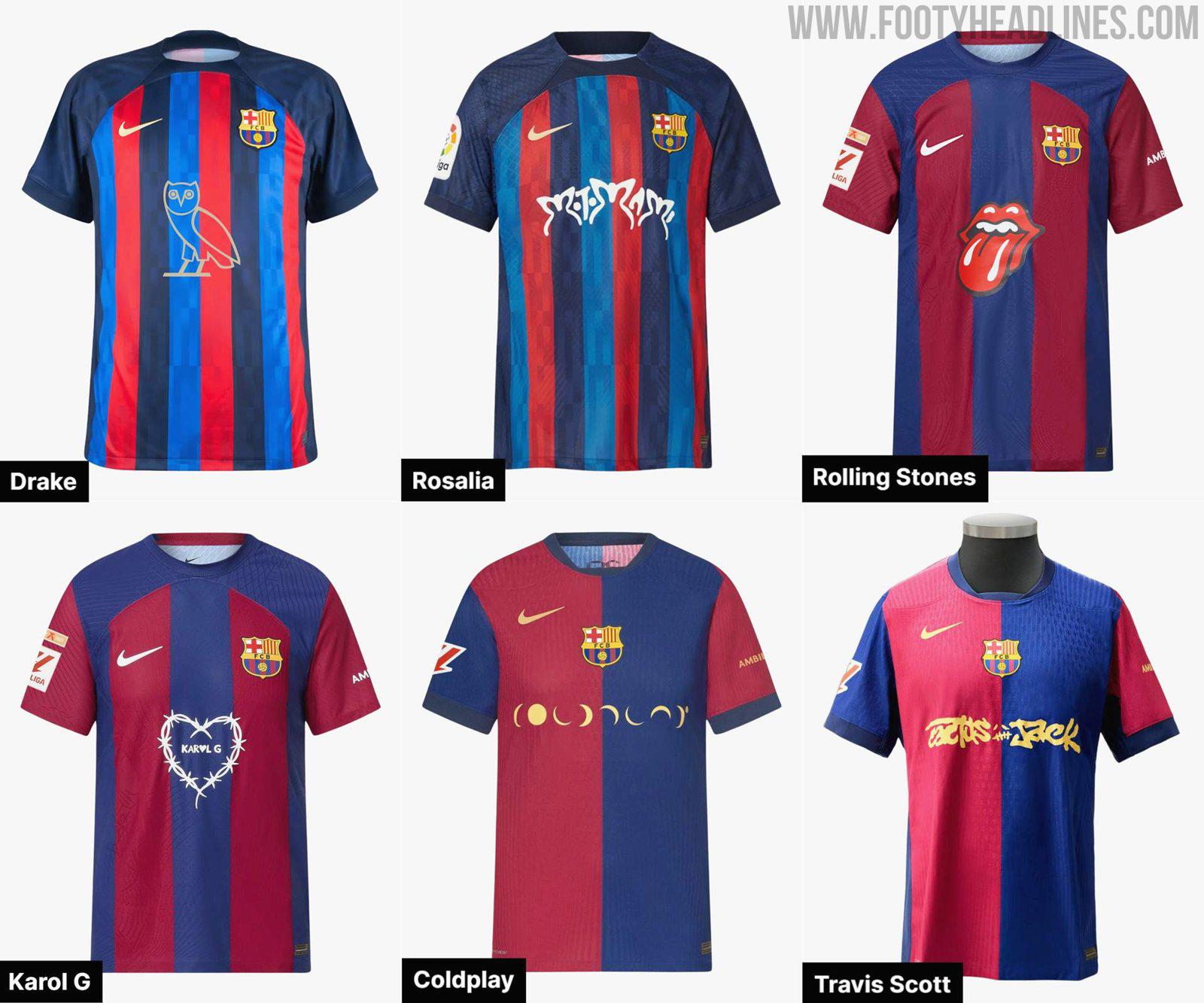 在音乐播放软件声破天赞助巴萨胸前广告后,每个赛季西甲的国家德比球衣胸前广告与不同歌手进行合作就成了巴萨的传统之一。此前包括酷玩乐队、Drake和Travis Scott等多位大牌艺人都曾与巴萨的国家德比球衣进行过联名。